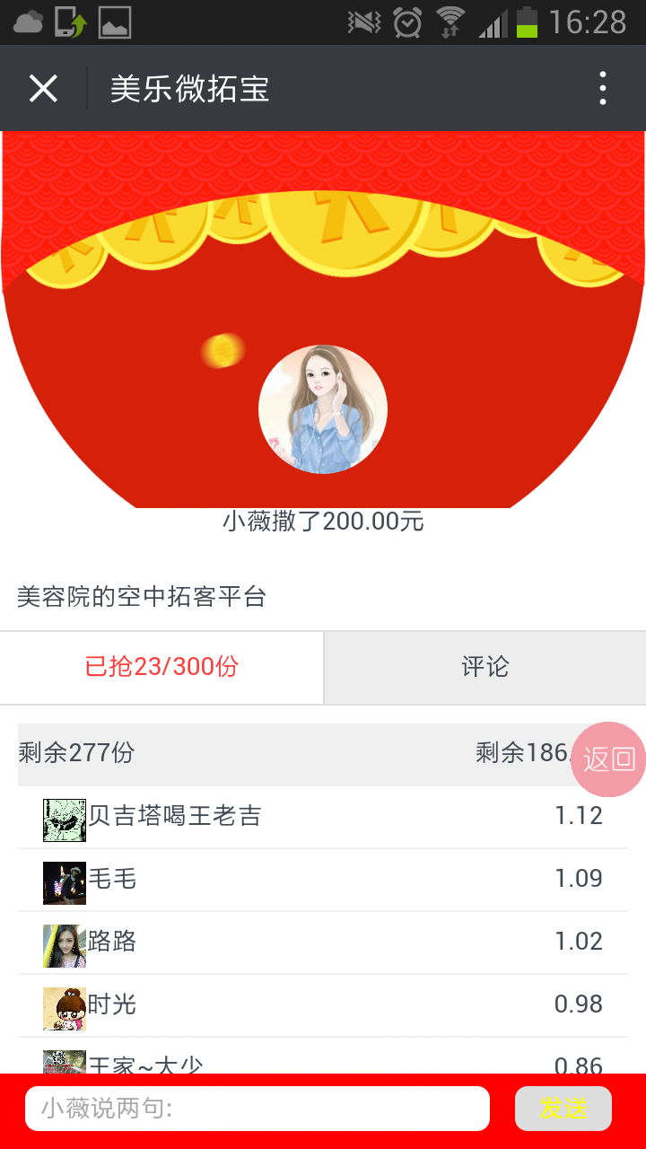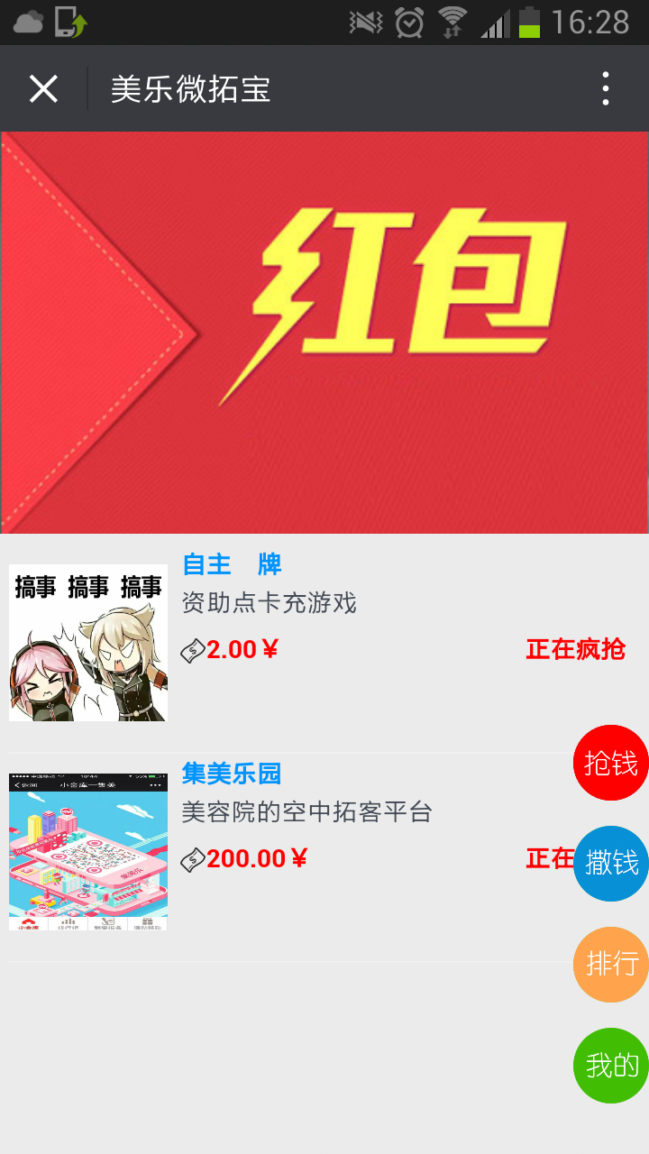 抢红包裂变工具产品介绍:在移动互联网+持续发酵的今天,微信已经变成我们每一天沟通的重要工具,在每一个人的手机中微信是必不可少的软件;有了它,我们的沟通近了,我们组群找到组织了,更重要的是我们能够愉快地抢红包了;无论大群、小群、还是朋友之间,只要有人撒了红包,群里气氛顿时活跃了,潜水的出来了,场面马上热闹了,可见大家都非常喜爱抢红包这项轻松且愉快的活动。![]() 抢红包的威力:1、微信:2016年春节,除夕当日微信红包的参与人数4.2亿人,收发总量80.8亿个,是2015年春节除夕当日10.1亿个的近8倍。2、QQ:2016年春节,除夕当日QQ红包的参与人数3.08亿人。收发总量22.34亿个。除夕夜全球QQ用户共“刷”1894亿次,参与QQ红包活动用户中,90后占到了75%以上。 3、支付宝:2016年春节,除夕当日抢五福活动,支付宝红包总参与3245亿次,共有近80万人集齐五福红包。三四线城市参与支付宝红包的用户占比64%。 ![]() 既懂吸粉、又懂赚钱的红包拓客工具来了:1、吸粉红包:抢红包必须要关注公众号后才可以抢。2、距离红包:设定自己店位置现场范围内多少公里的用户才可以抢红包 。 3、密码红包:商家把广告或优惠券通过图片或文字描述将密码包含其中推送红包。 4、裂变红包:转发红包,裂变下线,为上线贡献每笔红包10%,让大家都乐意转发。 ![]() 微信抢红包是非常棒的宣传工具:快、准、狠!商家“撒钱”发红包,活动广告信息随着抢红包进入每个粉丝眼中,商家撒的开心,粉丝抢的高兴。你有红包、我有红包、大家都有红包,才是真的好红包!![]() ![]() ![]() ![]() |