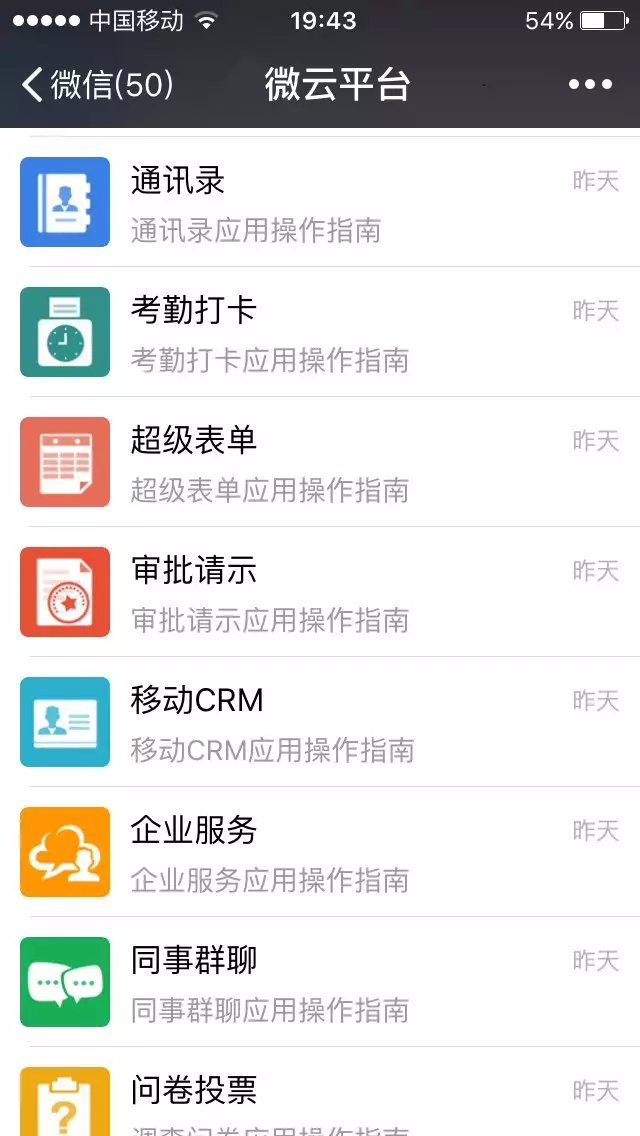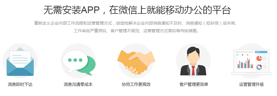 企业微信移动办公平台产品介绍:朗云移动办公无纸化管理系统是一套搭建在企业微信的无纸化办公系统,员工使用手机微信即可完成日常工作汇报、审批、通知、考勤等操作。无线安装任何APP,直接微信上就能移动办公的平台。主要特点:消除信息孤岛的信息管理系统:● 打造高度集成化和协同化的信息网络,加快了信息传递速度; ● 组织内部的信息可以安全、快速的传递至分子公司、各级部门、上下级机构和其他相关组织; ● 整合异构系统,实现集团内组织的互联互通,资源、信息共享。 提高工作效率的业务处理系统: ● 优化企业组织结构和流程设定,缩减冗余业务处理层,简化协同办公运作的环节和程序,完全电子化的事务处理流程; ● 强大的流程管理功能使组织事务处理更规范化、透明化和便捷化; ● 协同的办公环境,整合组织内各职能部门、上下级单位和外部机构等资源,以交互的方式进行业务协作,大大提升了事务处理的效率,促使协同办公运作成本的减少。 增强领导掌控能力的决策支持系统: ● 帮助管理人员及时获得组织内外信息,节约时间和精力,强化领导的监控管理,增强管理者对组织的控制力; ● 信息的迅速传递和全面的协同性提供完整的、整合的决策基础数据,各种分析报表进一步支持决策; ● 保证领导层实时、全面掌控各级组织的工作状态,及时发现问题及时解决,防止低效办公。 功能模块:1.行政办公:微信考勤:微信摇一摇即可签到,告别传统考勤机 审批:审批通知微信直达,业务流转更顺畅 开会:订会议室、通知、签到、记录一次搞定 报销:一键填单闪电报销,月底票据整理不再麻烦 请假:病假、事假、年假随时发起,系统申报方便规范 2.销售管理: 移动CRM:实时掌握客户资料,把握每个销售机遇 外勤签到:了解员工去向,拜访、签到随时查看 车辆管理:公司车况一手掌握,申请用车分分钟解决 知识百科:构建公司自己的百科全书,最新资料随手查阅 3.工作协同: 通讯录:自动更新、关键字检索,找人不再成问题 任务分派:任务指派到负责人,快速高效完成任务 同事群聊:方便项目小组即时沟通交流,重点会议记录备忘 工作日志:员工实时汇报工作,团队工作进度尽在掌握 4.企业文化: 新闻公告:公司最新消息及时通告,支持保密消息及阅读范围 企业活动:活动发布、报名、统计、反馈一体化 问卷投票:全方位调研收集信息,导出、处理、分析一步到位 同事社区:创建畅所欲言新天地,促进同事沟通零距离 5.自定义表单: 企业可以将常用表单设计到平台中,并设置好审批流程,即可在平台中流转 软件截图:![]() ![]() ![]()