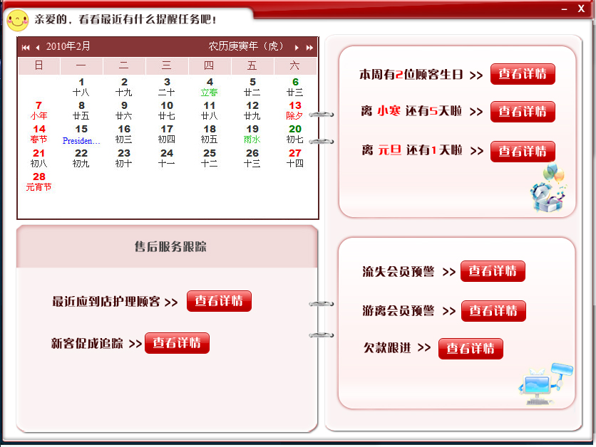 美容院店务管理系统产品介绍:当美容院的常规会员多于200个的时候,面对越来越繁琐的档案管理,数据分析,报表整理,此时美容院必须使用更为高效准确的管理方式来管理日常的档案,数据和报表。这时就需要使用“店务经营管理系统”,来管理店里的人财物了。![]() 我司研发的“店务经营管理系统”的核心目标是以数字化、清晰化、精确化来管理美容院的人、财、物。管理范围涵盖:会员档案管理、库存管理、财务管理、业绩管理、营业数据分析、会员消费分析、店面销售分析、薪酬制度标准、岗位职责、标准服务流程设计等等。 ![]() 系统涉及:美容院店务经营管理系统、销售系统、会员档案系统、工资提成核算系统、电话系统、短信系统、库存管理系统、利润分析系统、客户邀约系统、员工管理系统、卡项管理系统、客户关怀系统。 ![]() |